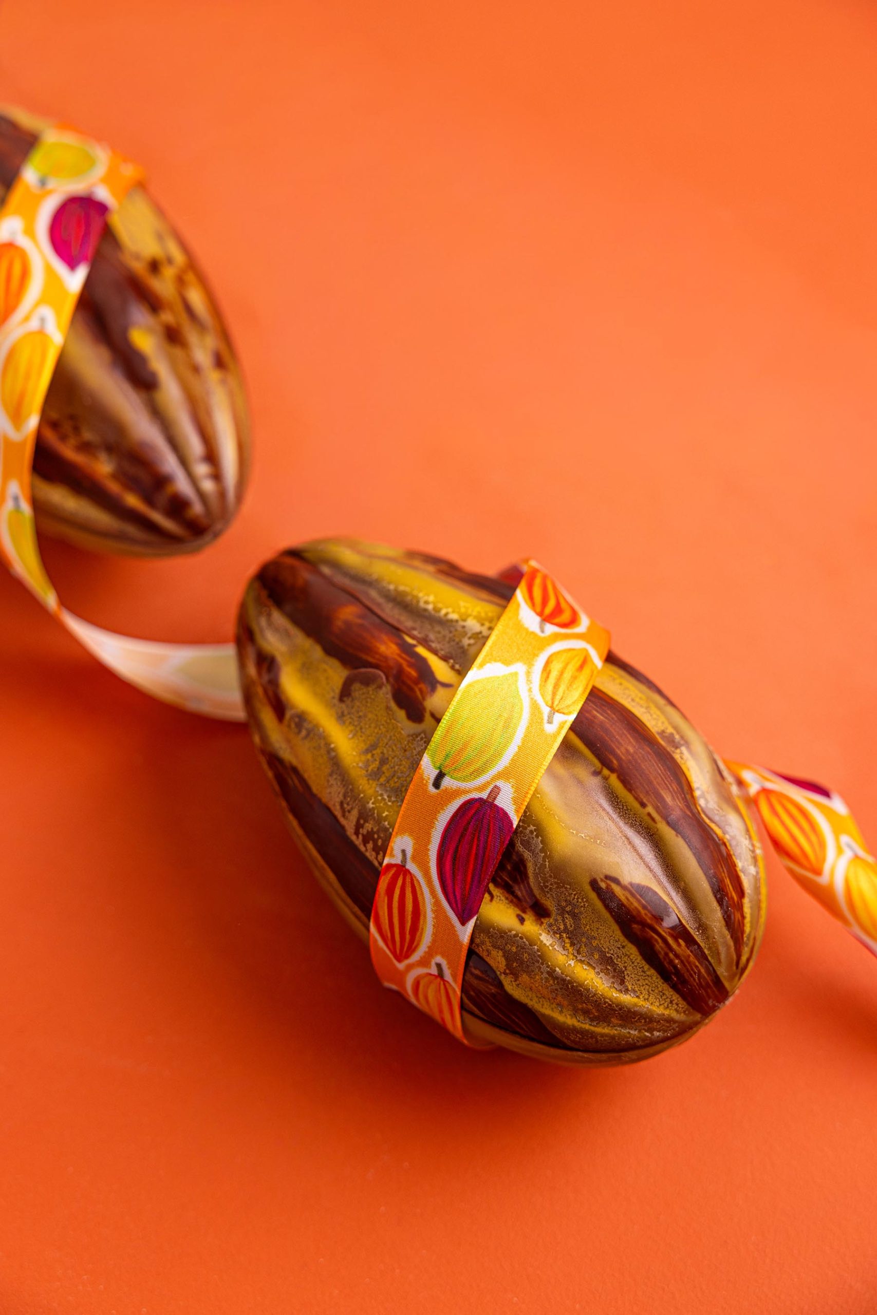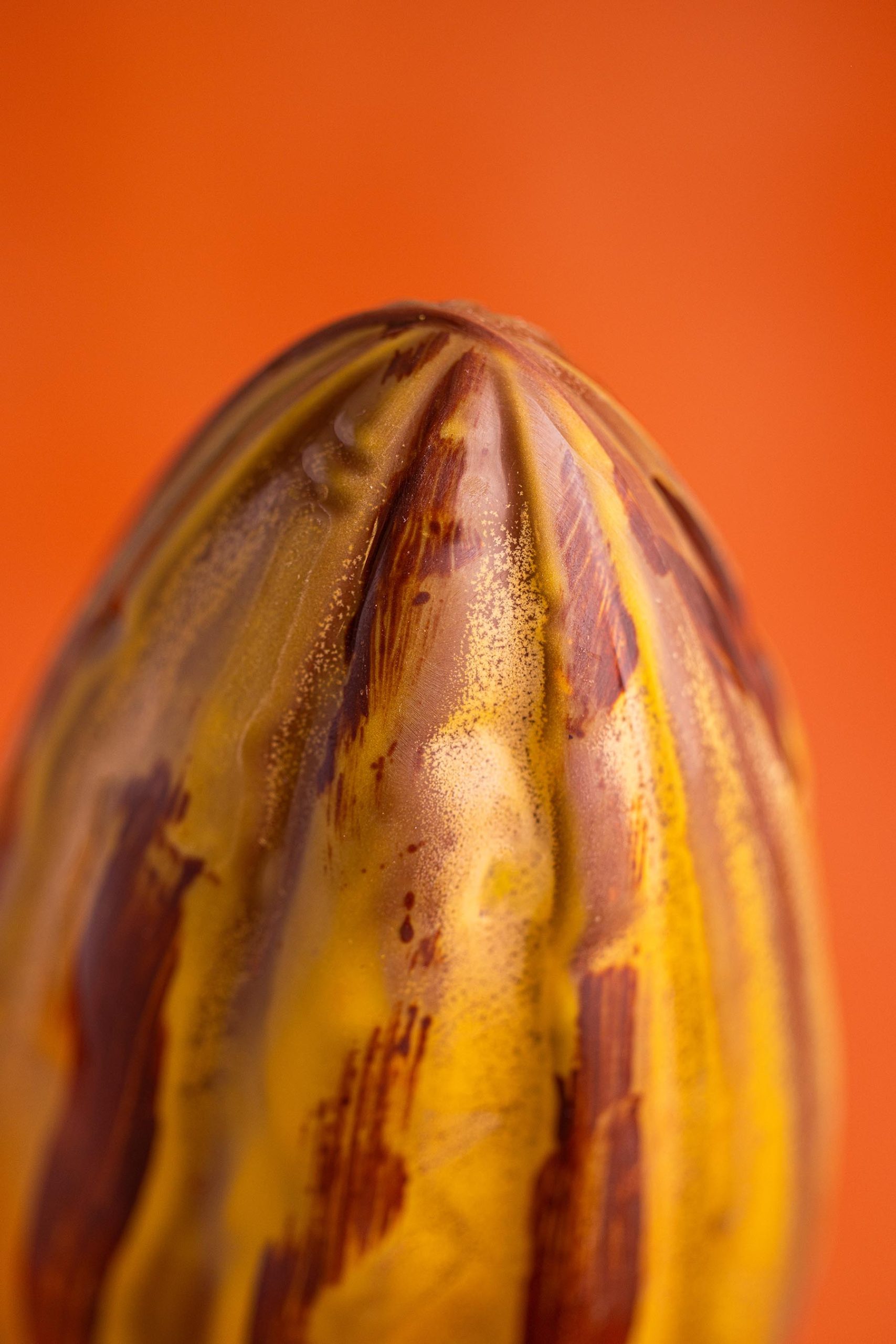 Nos cabosses de cacao sont garnies de fritures en chocolat et disponibles en boutique en chocolat noir, lait ou blanc.